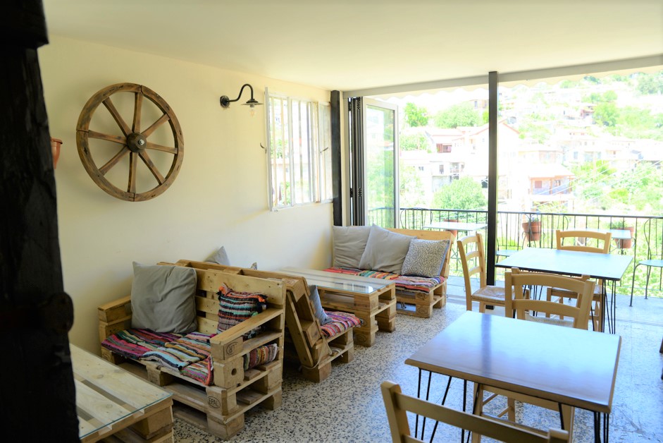 On the other side, there is a comfortable and colorful sitting area with beautiful mountain views and even shisha!