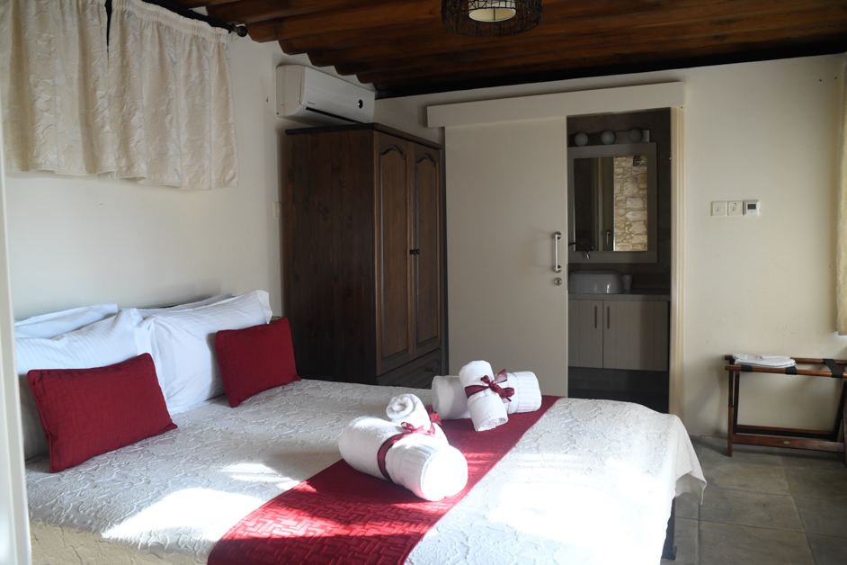 You will love the impeccably clean, huge rooms and the tall beds, – the kind of beds you have to climb to get into. Other perks include a safe box, A/C, Central heating, fireplace (Eleni Suite), fridge, towels, and Kitchenette (in the suites)